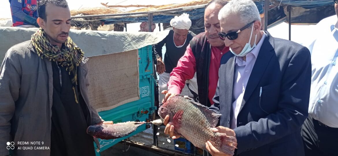 كما تفقد مصيلحي، ميناء الصيد بجرف حسين واستمع للصيادين العاملين بالميناء وتابع سير العمل وانتاج البحيرة من الأسماك، كما توجه إلى مقر ادارة بحيرة السد العالى واجتمع مع العاملين بالإدارة واستمع إلى مطالبهم ووجه لهم جميعا الشكر على انجازهم للأعمال المتعلقة بالصيادين في أسرع وقت.