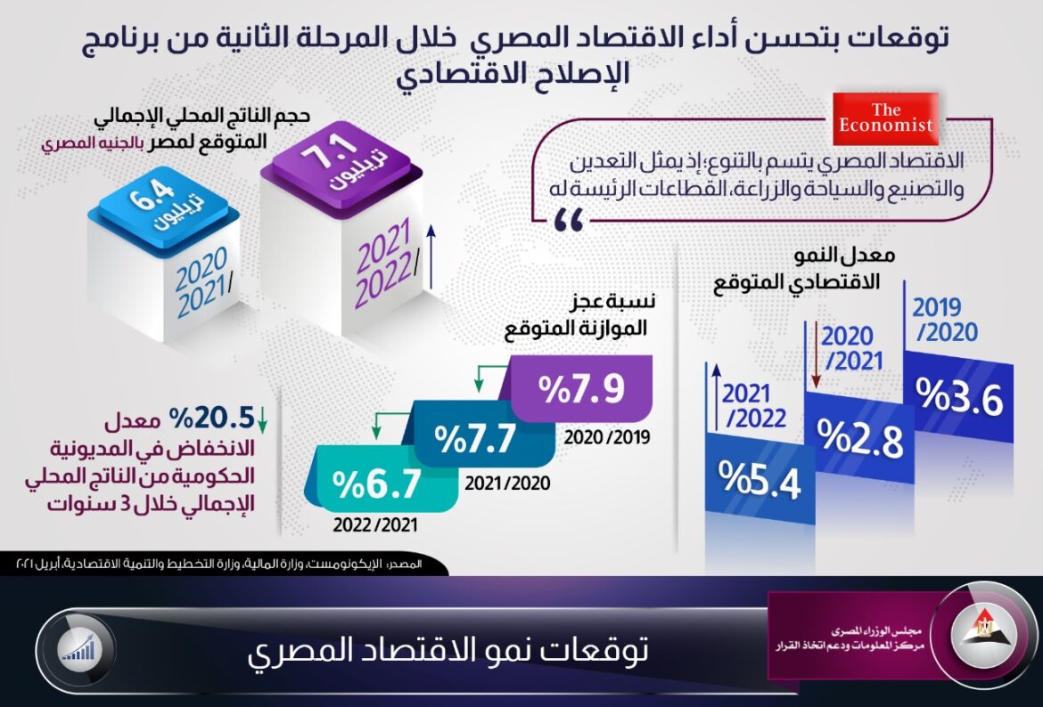 وتتوقع الحكومة وصول حجم الناتج المحلي الإجمالي لمصر في 2021/ 2022 إلى 7.1 تريليون جنيه، مقارنة بنحو 6.4 تريليون جنيه في 2020/ 2021، بمعدل نمو 5.4% في 2021/ 2022، مقارنةً بنحو 2.8% في 2020/ 2021، كما توقع انخفاض عجز الموازنة ليصبح 6.7% في 2021/ 2022، مقارنةً بـ 7.7% في 2020/ 2021، و٧,٩٪ ٢٠١٩/ ٢٠٢٠